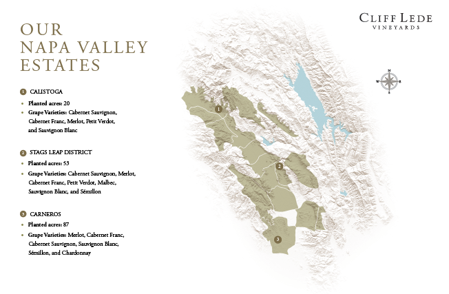 Cliff Lede Vineyards is a multi-generational family-owned and operated winery that farms over 160 acres of exceptional estate vineyards in Napa Valley. Located in the famed Stags Leap District, the focus is on Cabernet Sauvignon with “Poetry” and “Rhythm” being the highest expressions of this unique property. Additional estate vineyards in Carneros and Calistoga naturally balance the portfolio of Napa Valley wines. For over 20 years, Cliff Lede Vineyards has prioritized crafting wines of extraordinary quality with authenticity and sustainability in mind.